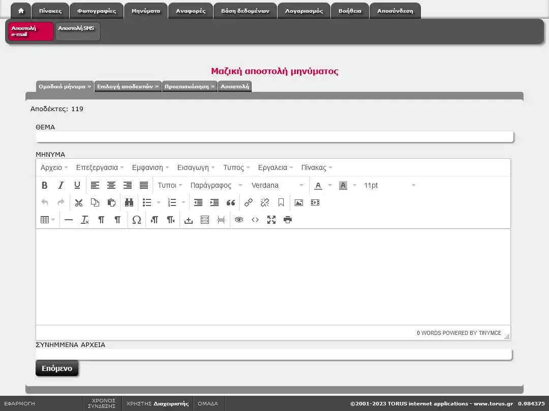 Στην αρχική φόρμα συμπληρώνουμε ένα θέμα για το e-mail, το μορφοποιημένο κείμενο αναλυτικά και αν επιθυμούμε, συνημμένα αρχεία (π.χ. pdf) και κάνουμε κλικ στο πλήκτρο [Επόμενο].