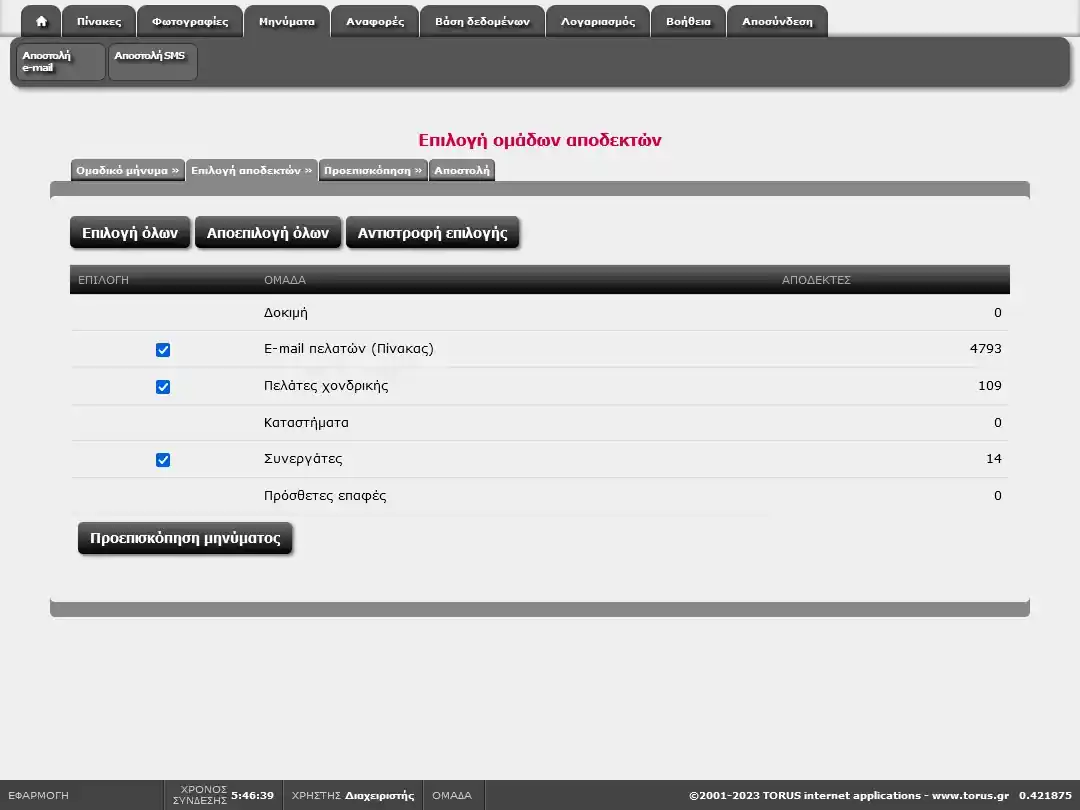 Στην επόμενη καρτέλλα, επιλέγουμε την ομάδα ή τις ομάδες αποδεκτών που θα λάβουν το μήνυμα και κάνουμε κλικ στο πλήκτρο [Προεπισκόπηση μηνύματος].