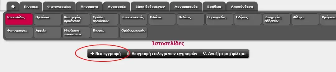 Για να εισάγετε νέα εγγραφή / γραμμή στον κάθε πίνακα επιλέγετε το [Νέα εγγραφή] στο πάνω μέρος του πίνακα.