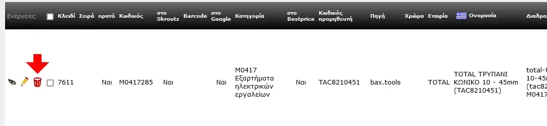 Για να διαγράψετε μια εγγραφή / γραμμή του πίνακα, επιλέγετε το εικονίδιο με τον κάδο αριστερά από την εγγραφή που θέλετε να διαγράψετε.