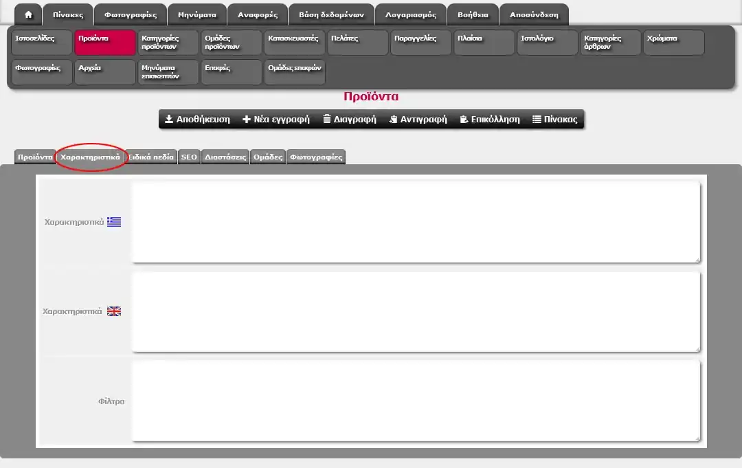 Πεδίο στο οποίο καταχωρούνται τα τα χαρακτηριστικά του προϊόντος, ένα σε κάθε γραμμή (χωρισμένα με [Enter]). Κάθε χαρακτηριστικό αποτελείται από το όνομά του, τον χαρακτήρα «:» (άνω-κάτω τελεία) και την τιμή του. Για παράδειγμα το κείμενο: Υλικό: Χρώμιο - Βανάδιο Μετατρέπεται σε: