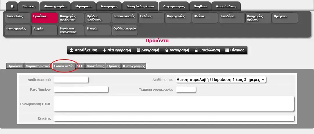 | Κόστος μεταφοράς | Πεδίο στο οποίο συμπληρώνετε το κόστος μεταφοράς του συγκεκριμένου προϊόντος. Χρησιμοποιείται για μεγάλα ή βαριά προϊόντα που αποστέλλονται με μεταφορική εταιρία και αποτελούν από μόνα τους ένα δέμα |