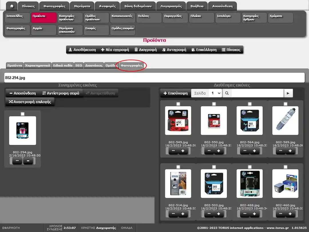 Στην τελευταία καρτέλλα «Φωτογραφίες» μπορούμε να επισυνάψουμε φωτογραφίες στο συγκεκριμένο προϊόν. Στο αριστερό πλαίσιο εμφανίζονται οι συνημμένες φωτογραφίες ενώ στο δεξί πλαίσιο όλες οι διαθέσιμες φωτογραφίες που έχουν φορτωθεί στον ιστότοπο.